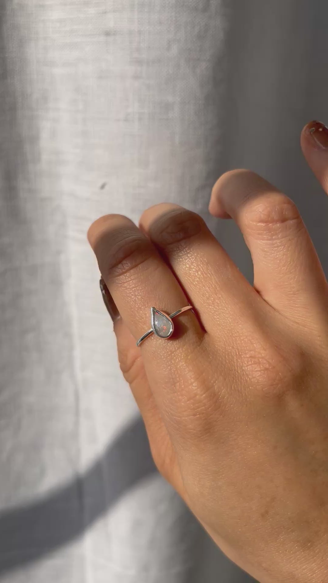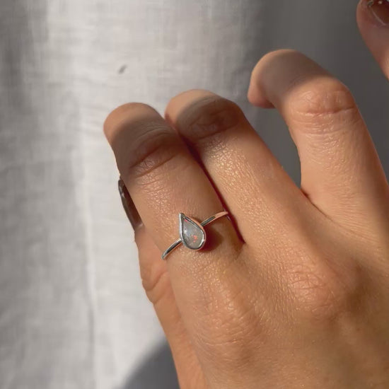 The ring features a tear drop shape Australian opal that creates an eye-catching contrast against the opal's dreamy blue-grey body under the sunlight.