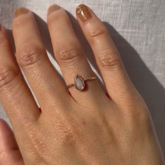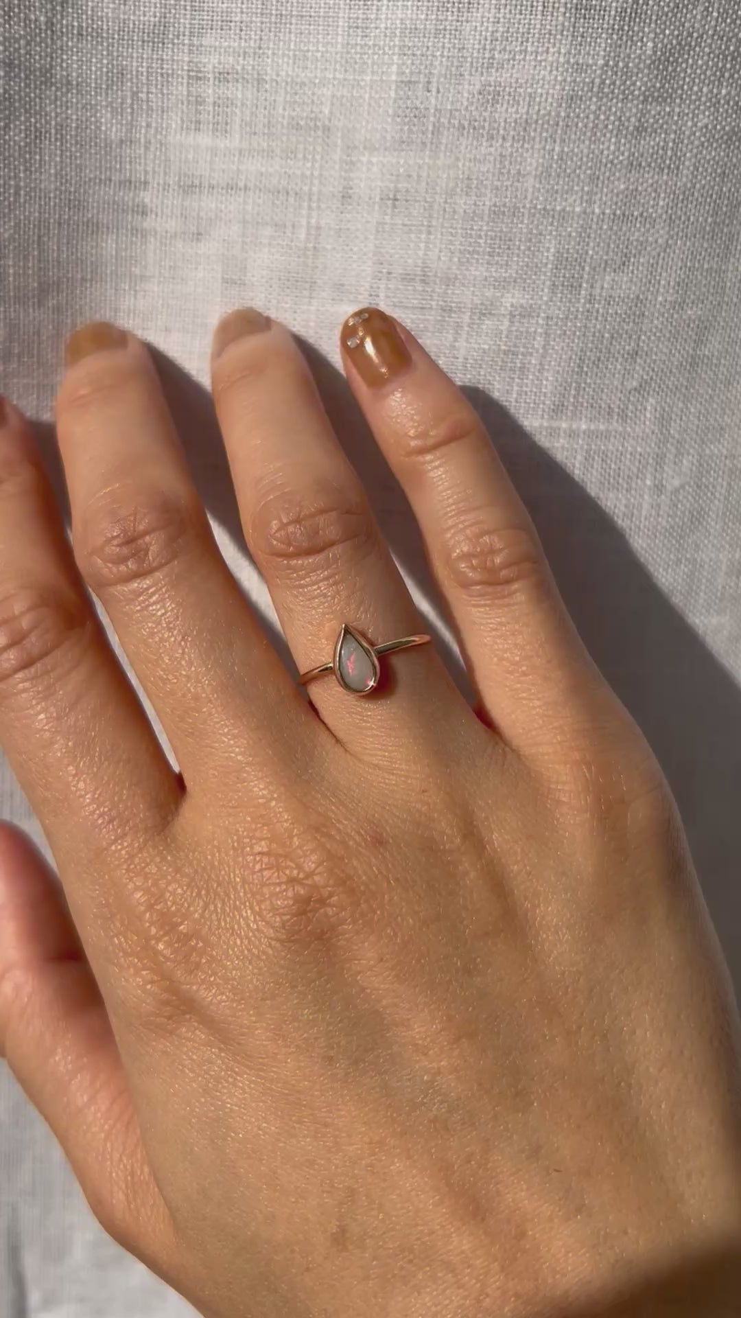 The ring features a tear drop shape Australian opal that creates an eye-catching contrast against the opal's dreamy milky grey body under the sunlight.